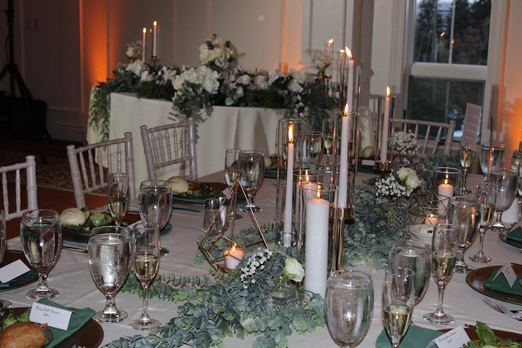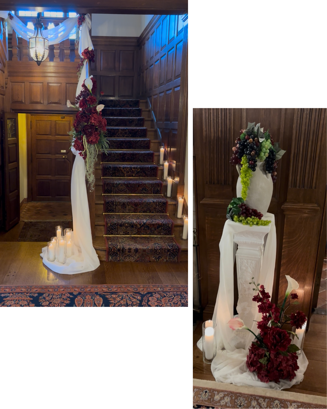 Backdrops and styled rental items such as unique vases, candles, decorative risers, and silk floral arrangements for your guest tables, welcome table, sweetheart table, dessert table etc., are conveniently available and can be added to this package. Touches of fresh florals such as single stem roses in our beautiful selection of vases make beautiful additions. We also offer special touches such as custom ribbons and signage.